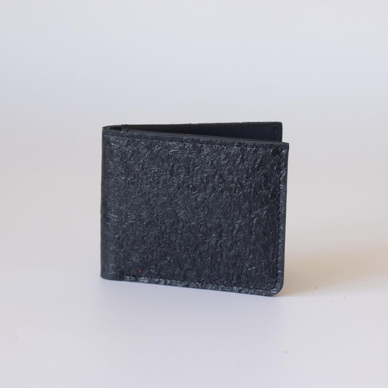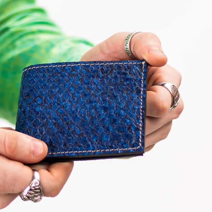 This handmade leather wallet is crafted from ethically sourced fish skin leather, offering a distinctive texture and an ultra-thin yet spacious bifold design.